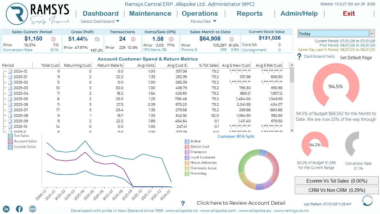 This screen provides a clear, month-by-month view of customer behaviour for the selected account. It combines spend, returning customer activity, and customer quality (RFM) into a single dashboard to help you understand how customers are interacting with your business over time.