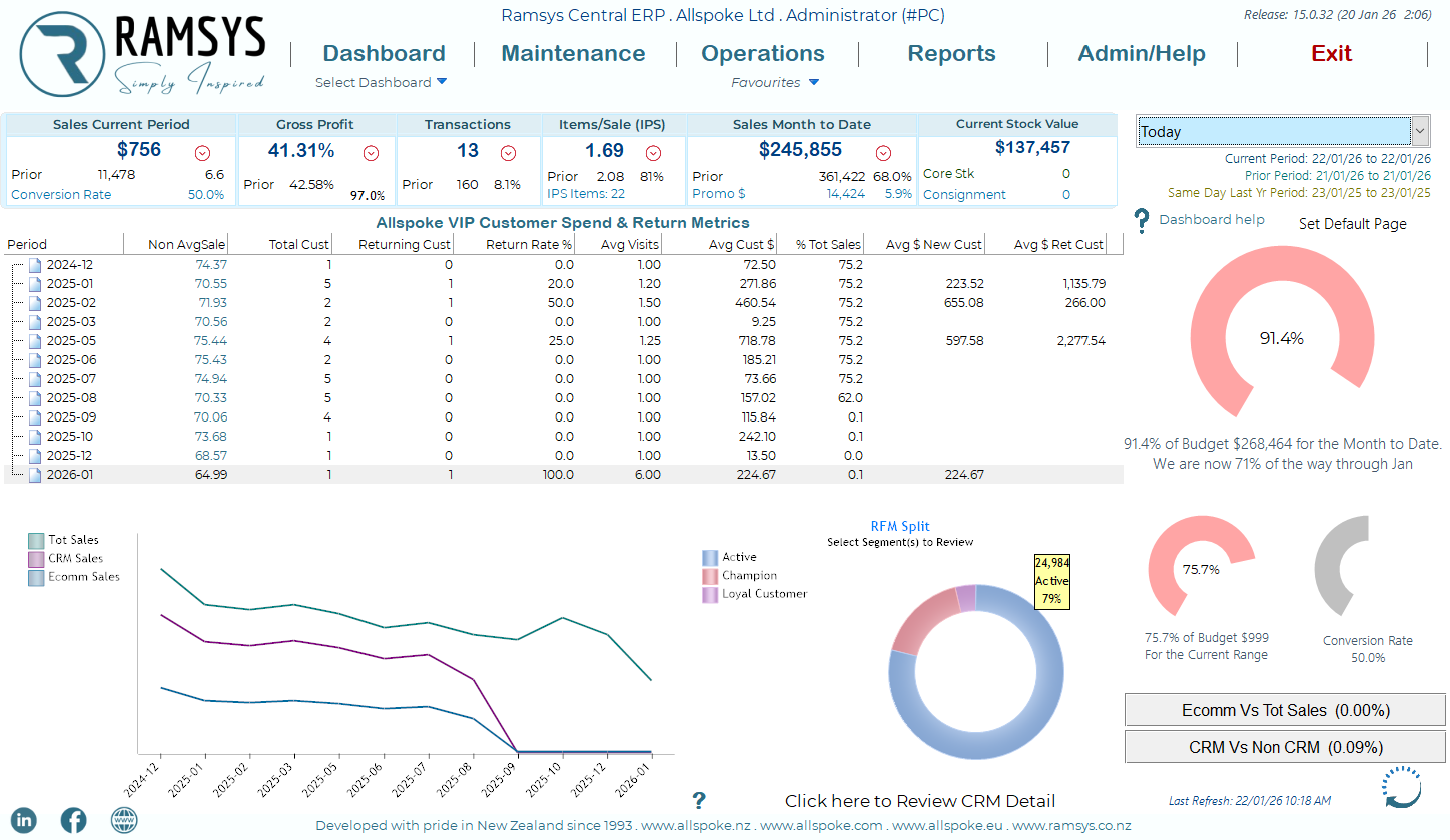 The CRM Dashboard provides a detailed view of VIP customer activity, spend, and return behaviour. It combines sales, loyalty, and return metrics into one screen, enabling you to monitor customer engagement and value at a glance.