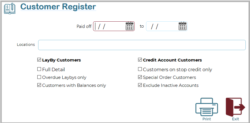Use these date fields to report on customers whose laybys or accounts were paid off within a specific date range. Leave both fields blank to include all customers.