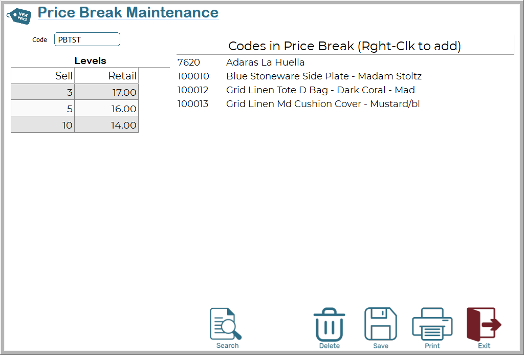 The Price Break Maintenance screen allows you to define quantity-based retail discounts for selected stock items. A Price Break enables you to offer lower prices when customers purchase higher quantities of an item.