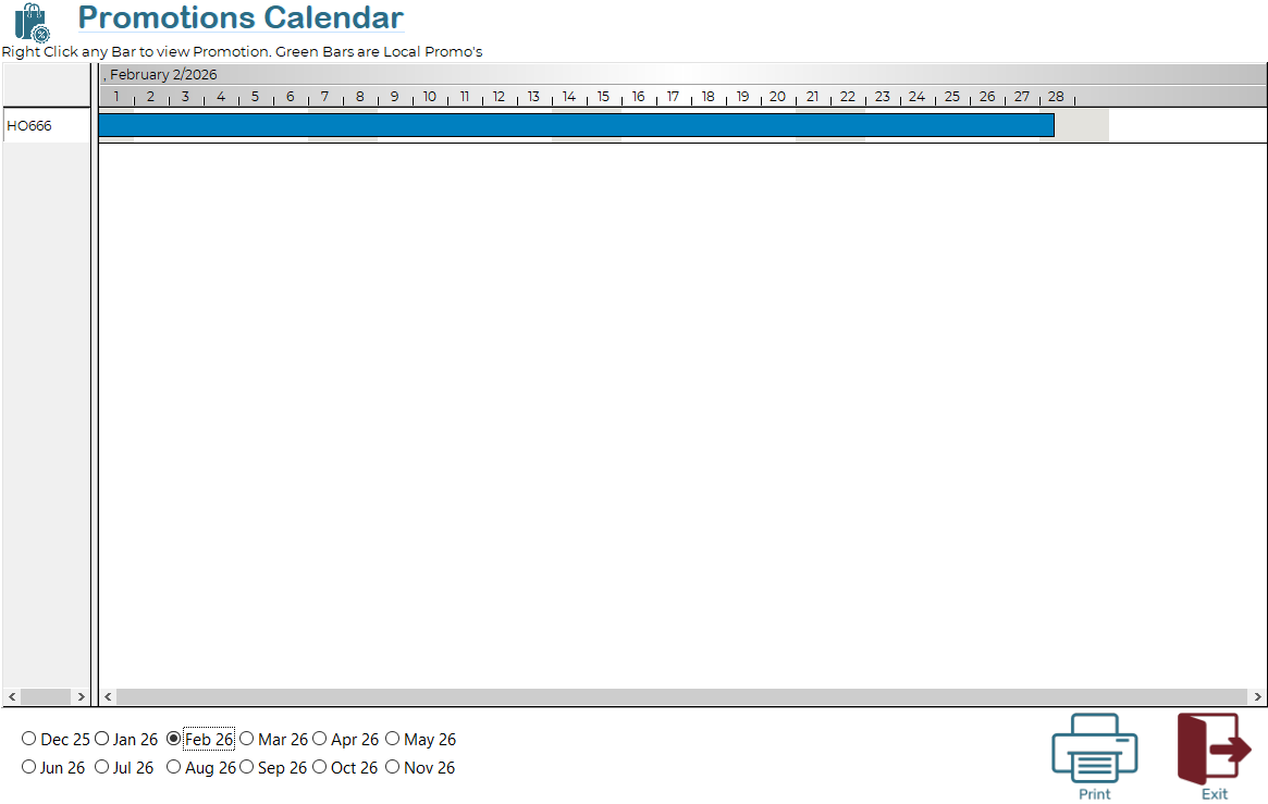 The Promotion Calendar is a valuable tool that offers an easy-to-view calendar displaying all the promotions scheduled for each month. Each promotion is represented by a bar, which clearly shows its description and date range.
