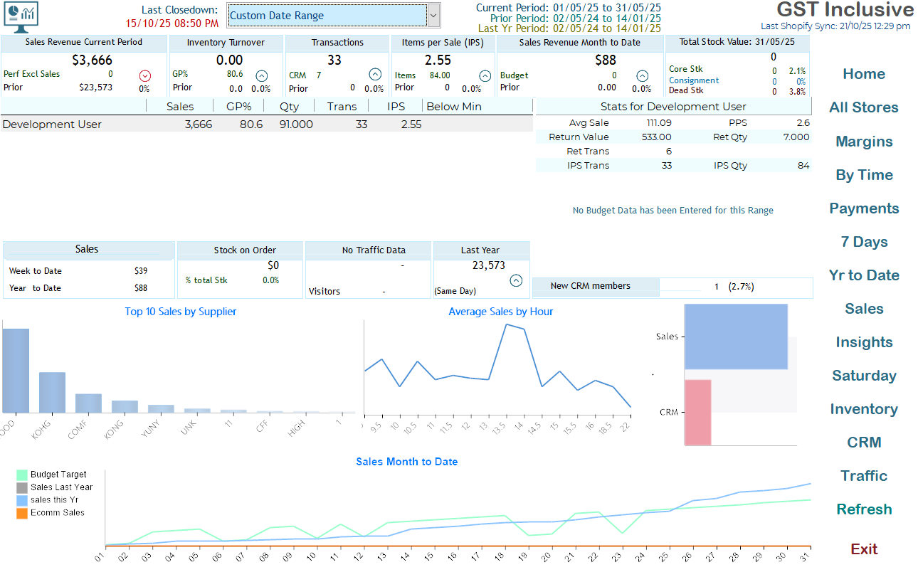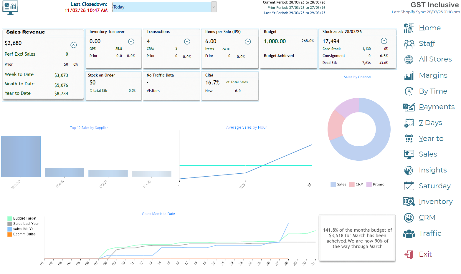 - Home, All Stores, Margins, By Time, Payments, 7 Days, Yr to Date, Sales, Insights, Friday, Inventory, CRM, Traffic, Refresh, Exit