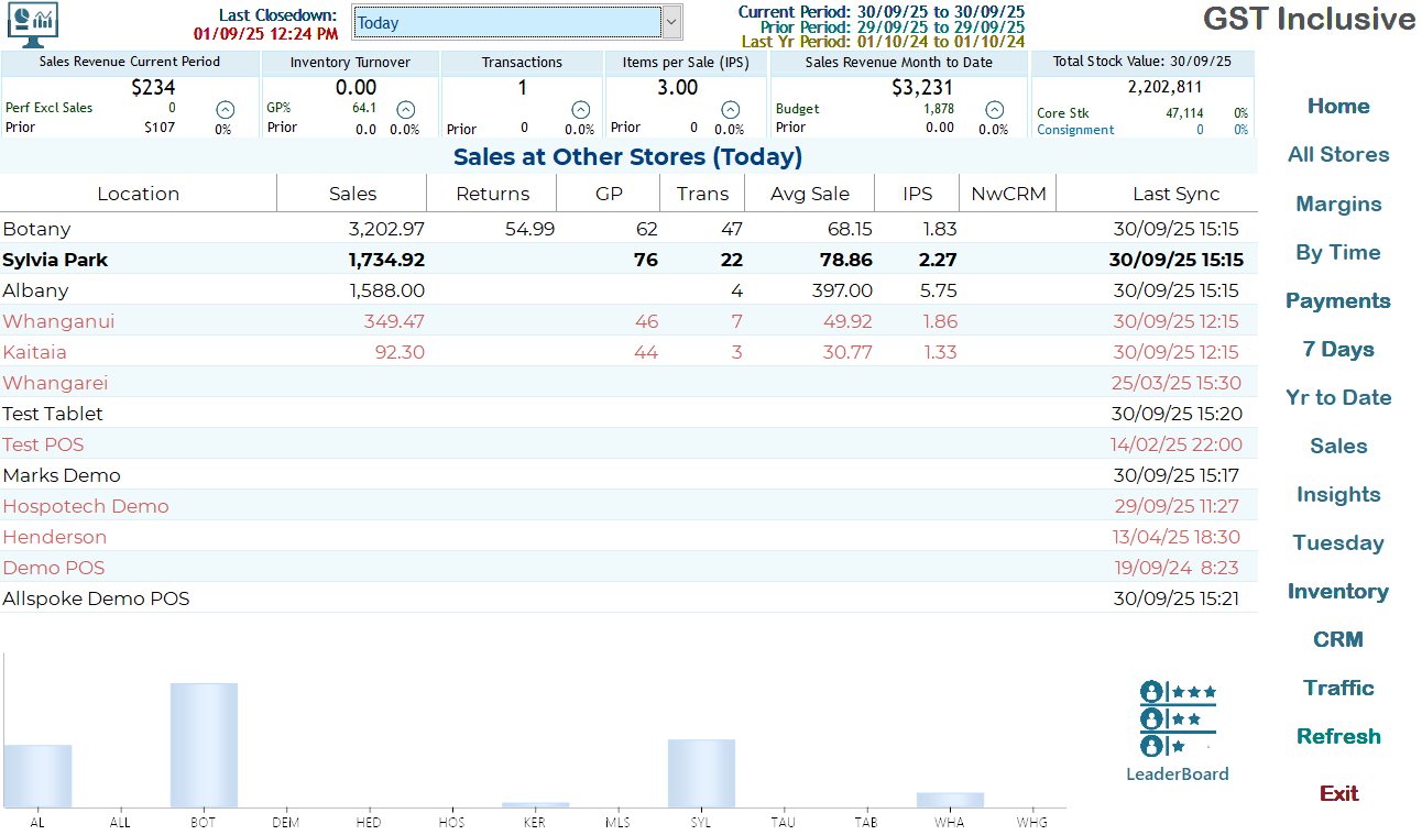 The Sales at Other Stores screen provides a quick overview of how your local store is performing compared to other stores in your network. This allows managers and staff to compare their performance and sales trends, identify high-performing locations, and detect potential issues in real time.