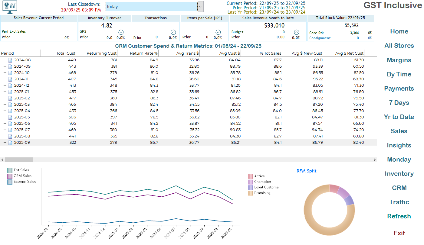 - Track loyalty: Look at the Returning Cust and Return Rate % to check how well you are keeping customers engaged.