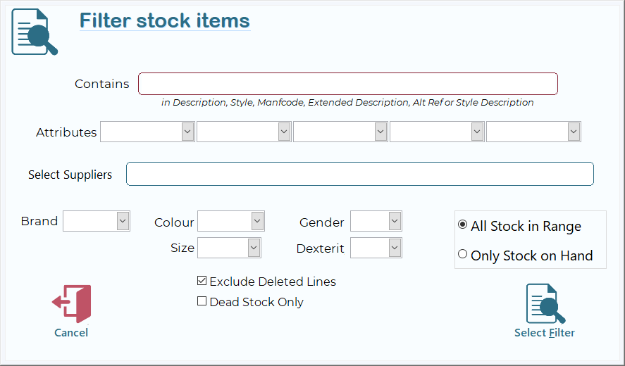Both searching for stock items in the stock master screen or Sales screen and searching for CRM members support this. Using this filter will reduce the number of items in the search making it much easier to find what you are looking for.