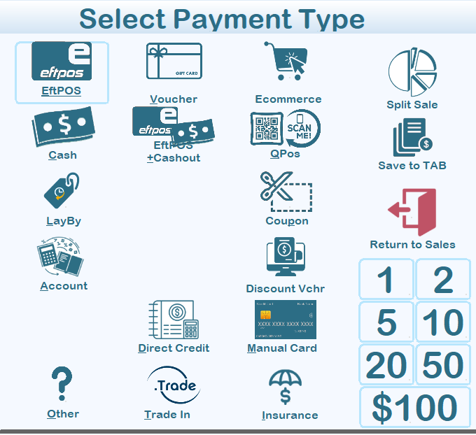 EFTPOS + Cashout: Allows EFTPOS payment plus issuing cash out to the customer.