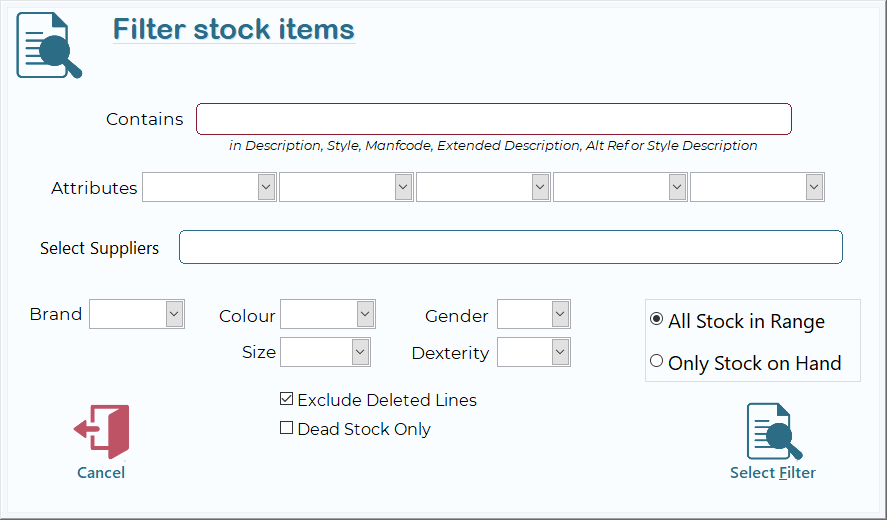 This page explains how to access and use each element of the Stock Filter screen: free-text searches, attribute dropdowns, supplier selection, additional filter fields, stock-range options, and action buttons. By combining these controls, you can quickly pinpoint the exact subset of your inventory you need.